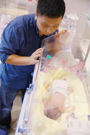 欧先生(化名)深情看着刚出生的宝宝