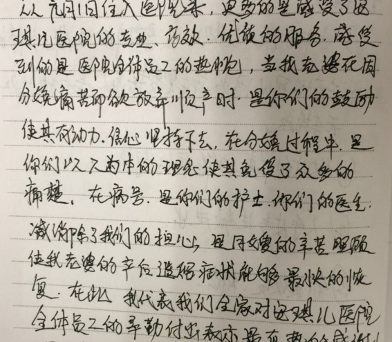 他在写给安琪儿的感谢信中,这样写道“从元月1日住入医院来,更多的是感受了安琪儿医院的专业、高效、优质的服务,感受到的是医院全体员工的热忱,当我老婆在因分娩痛苦而欲放弃顺产时,是你们的鼓励使其有动力、信心坚持下去,在分娩过程中,是你们以人为本的理念使其免受了众多的痛楚,在病房,是你们的护士、你们的医生,消除了我们的担心,是月嫂的辛苦照顾使我老婆的产后遗留症状能够最快的恢复。在此,我代表我们全家对安琪儿医院全体员工的辛勤付出表示最真挚的感谢!”