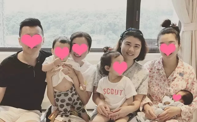 刘丽均与高颜值双胞胎姐妹花及家人的合影,图中双胞胎姐妹的宝宝都是刘丽均接生的