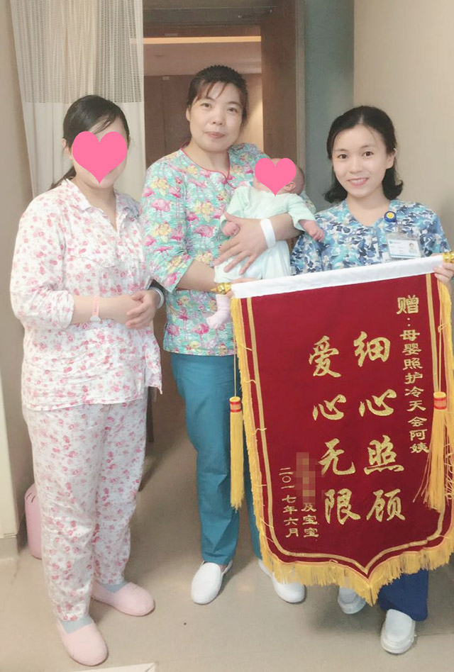 出院前一天,她为照顾自己和宝宝30多天的母婴护理师冷天会(月嫂)送了一面锦旗,以表感谢。